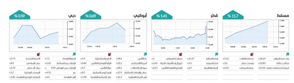 وتصدر سهم «المزايا القابضة» ارتفاعات أسهم سوق دبي للأسبوع الثاني على التوالي، ليصعد 7.5%، وارتفعت أسهم الإمارات ريم للاستثمار 5.16%، والإمارات دبي الوطني 4.99%، ودو 4.76%، وأليك القابضة 4.4%، وباركن 3.9%، وزاد إعمار للتطوير 3.5%، وإعمار العقارية 3.45%، والرمز كوربوريشن 3.2%.