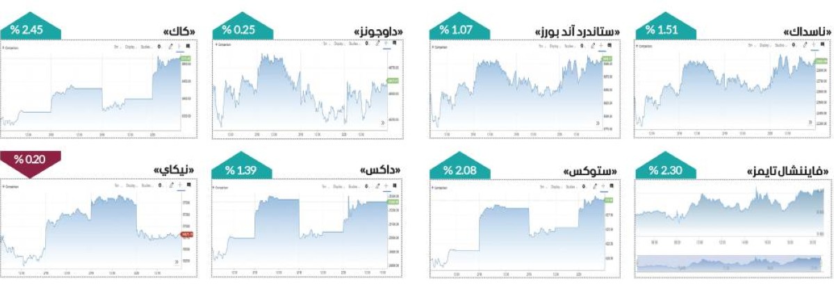 سجل مؤشر «ستوكس» الأوروبي ارتفاعاً بنسبة 2.08 %، ليغلق عند 630.56 نقطة مقارنة بـ617.70 نقطة في إغلاق الأسبوع السابق. وصعد مؤشر «داكس» الألماني بنسبة 1.39 %، منهياً الأسبوع عند 25260.69 نقطة، مقابل 24914.88 نقطة في الأسبوع السابق، كما حقق مؤشر «كاك» الفرنسي مكاسب بنسبة 2.45 %، ليغلق عند 8515.49 نقطة، مقارنة بـ8311.74 نقطة الأسبوع الماضي.