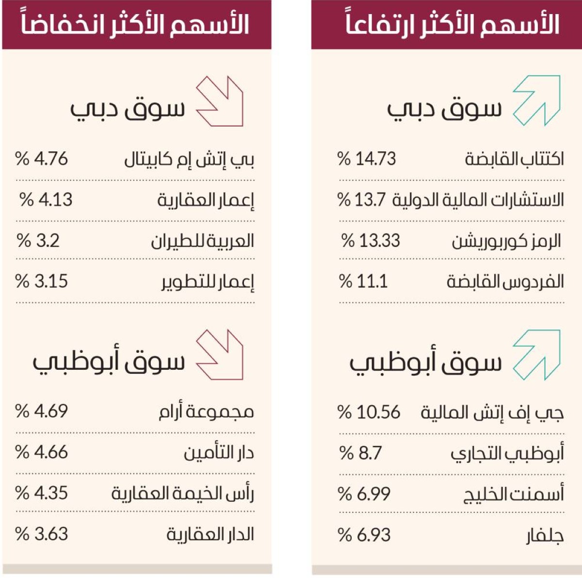 وتصدر «الدار العقارية» النشاط في سوق أبوظبي، مع استحواذه على النصيب الأكبر من إجمالي التداولات، بنحو 1.22 مليار درهم، تلاه «أبوظبي الإسلامي»، جاذباً 475.23 مليون درهم، ثم «أبوظبي التجاري»، بسيولة 317.95 مليون درهم. وارتفعت في سوق أبوظبي أسهم جي إف إتش المالية 10.56 %، وأبوظبي التجاري 8.7 %، وأسمنت الخليج 6.99 %، وجلفار 6.93 %.