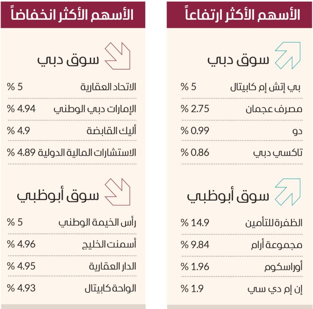 وكان ضمن الأسهم المرتفعة في سوق أبوظبي، أسهم الظفرة للتأمين 14.9% بالحد الأقصى، ومجموعة أرام 9.84%، وأوراسكوم 1.96%، وإن إم دي سي 1.9%، فيما انخفضت أسهم رأس الخيمة الوطني 5%، وأسمنت الخليج 4.96%، والدار العقارية 4.95%، والواحة كابيتال 4.93%.