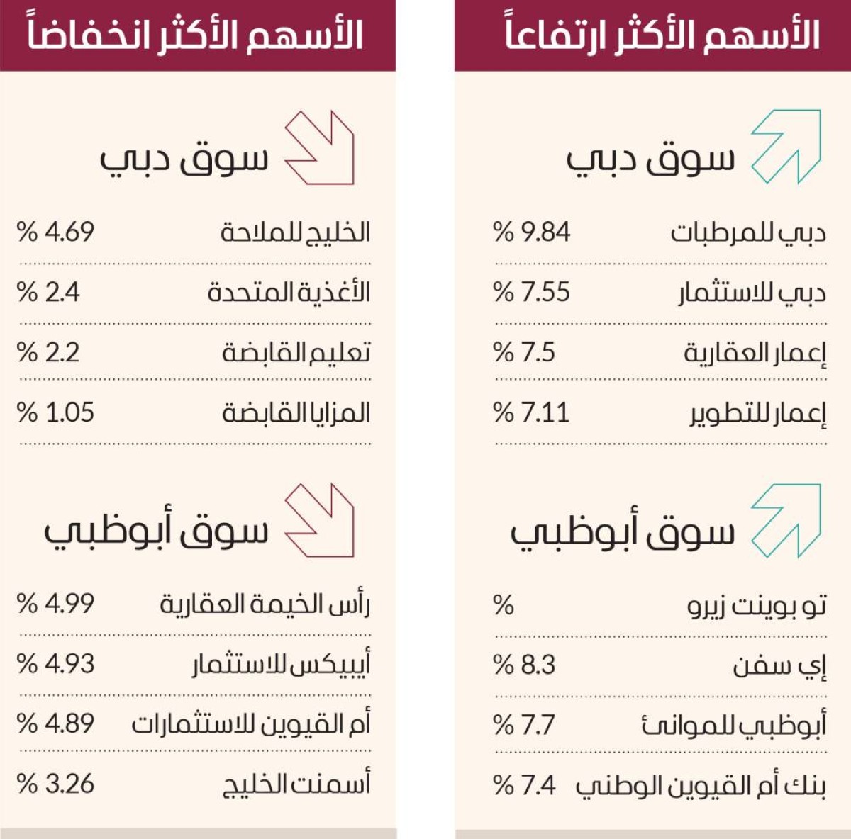 وصعدت أسهم دبي للاستثمار 7.55%، وطنية 5.7%، وأملاك للتمويل 5.5%، ودو 4.8%، فيما انخفضت أسهم الخليج للملاحة 4.69%، والأغذية المتحدة 2.4%، وتعليم القابضة 2.2%، والمزايا القابضة 1.05%. وشهد سوق دبي تنفيذ صفقة كبيرة مباشرة على أسهم شركة الخليج للملاحة القابضة، بقيمة إجمالية 39 مليون درهم، إذ تم تنفيذ الصفقة على 20.5 مليون سهم من أسهم الشركة، بقيمة 1.9 درهم للسهم الواحد. واتجه المستثمرون الإماراتيون نحو الشراء، بصافي استثمار 198.7 مليون درهم، بعد تحقيقهم مشتريات بقيمة 808.8 ملايين درهم، مقابل مبيعات بنحو 610.13 ملايين درهم.