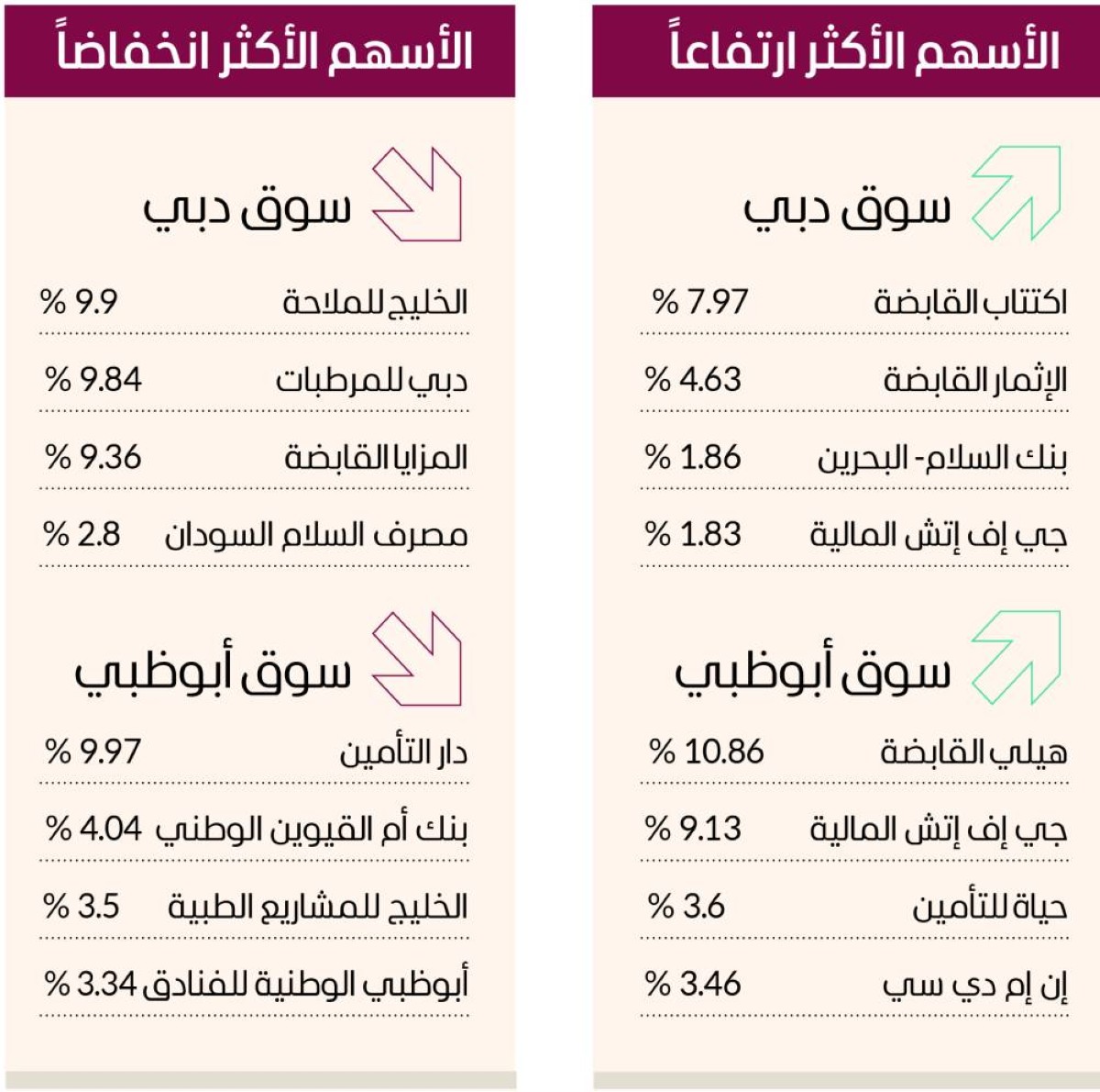 وارتفعت في سوق أبوظبي أسهم هيلي القابضة 10.86 %، وجي إف إتش المالية 9.13 %، وحياة للتأمين 3.6 %، وإن إم دي سي 3.46 %. في المقابل، تراجعت أسهم دار التأمين 9.97 %، وبنك أم القيوين الوطني 4.04 %، والخليج للمشاريع الطبية 3.5 %، وأبوظبي الوطنية للفنادق 3.34 %.