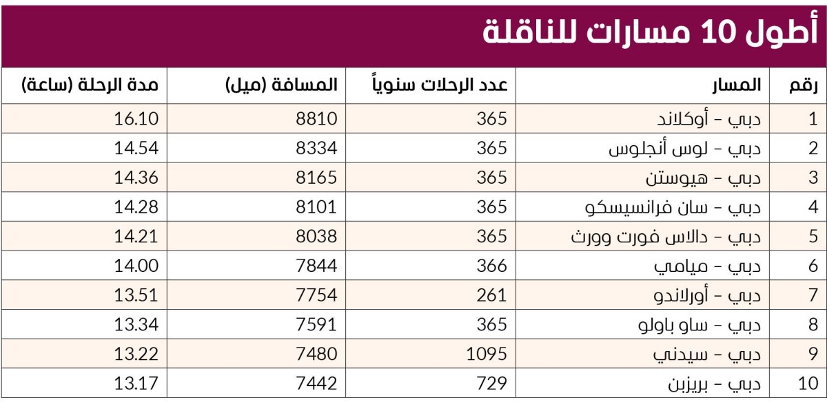 وتتصدر رحلة دبي – أوكلاند في نيوزيلندا قائمة أطول خطوط «طيران الإمارات»، إذ تمتد لمسافة 8810 أميال، أي ما يعادل الطيران المتواصل لأكثر من 16 ساعة عبر نصف الكرة الأرضية.