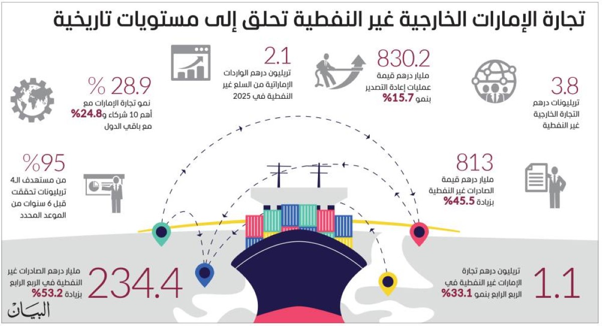 وتجاوزت ضعف رقم 2019. وفي الربع الأخير من 2025 سجلت تجارة الإمارات غير النفطية 1.1 تريليون درهم، لأول مرة في تاريخها، بنمو 33.1 %، مدعومة بنمو قياسي في الصادرات غير النفطية التي بلغت 234.4 مليار درهم خلال الفترة ذاتها، بزيادة 53.2 % مقارنة مع الربع المقابل من 2024 وبارتفاع 12 % مقارنة مع الربع الثالث من 2025.