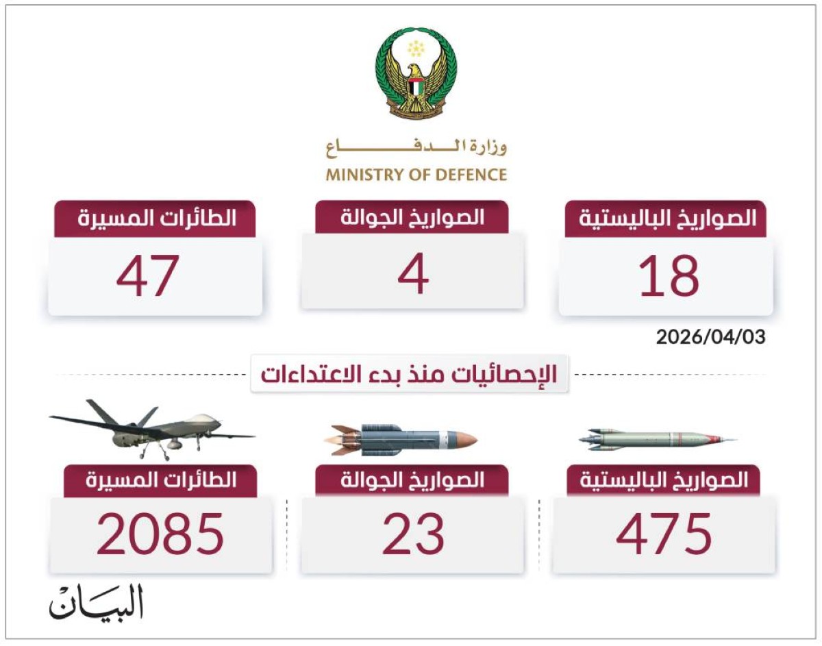 على صعيد متصل، تعاملت الدفاعات الجوية الإماراتية، أمس، مع 18 صاروخاً باليستياً، و4 صواريخ جوالة، و47 طائرة مسيّرة قادمة من إيران، ليبلغ بذلك إجمالي ما تم التعامل معه بحسب وزارة الدفاع 2583 صاروخاً ومسيّرة، بواقع 475 صاروخاً باليستياً، و23 صاروخاً جوالاً، و2085 طائرة مسيّرة.