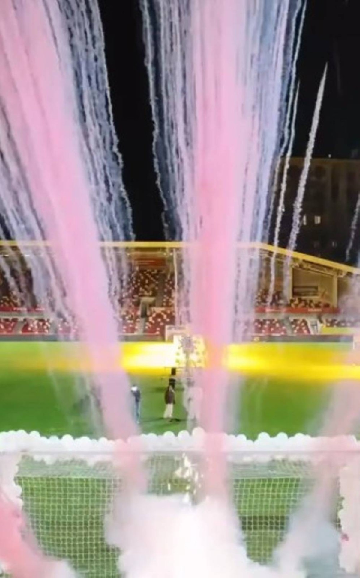 ومع ترقب زوجته الحاضرة على أرض الملعب، أطلق المدافع رميته الطويلة المميزة نحو الشباك، وما إن اصطدمت الكرة بالهدف، حتى انفجرت ألعاب نارية وتصاعد دخان وردي من العارضة، معلناً قدوم طفلة جديدة إلى العائلة، وسط أجواء احتفالية مؤثرة.